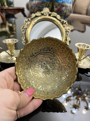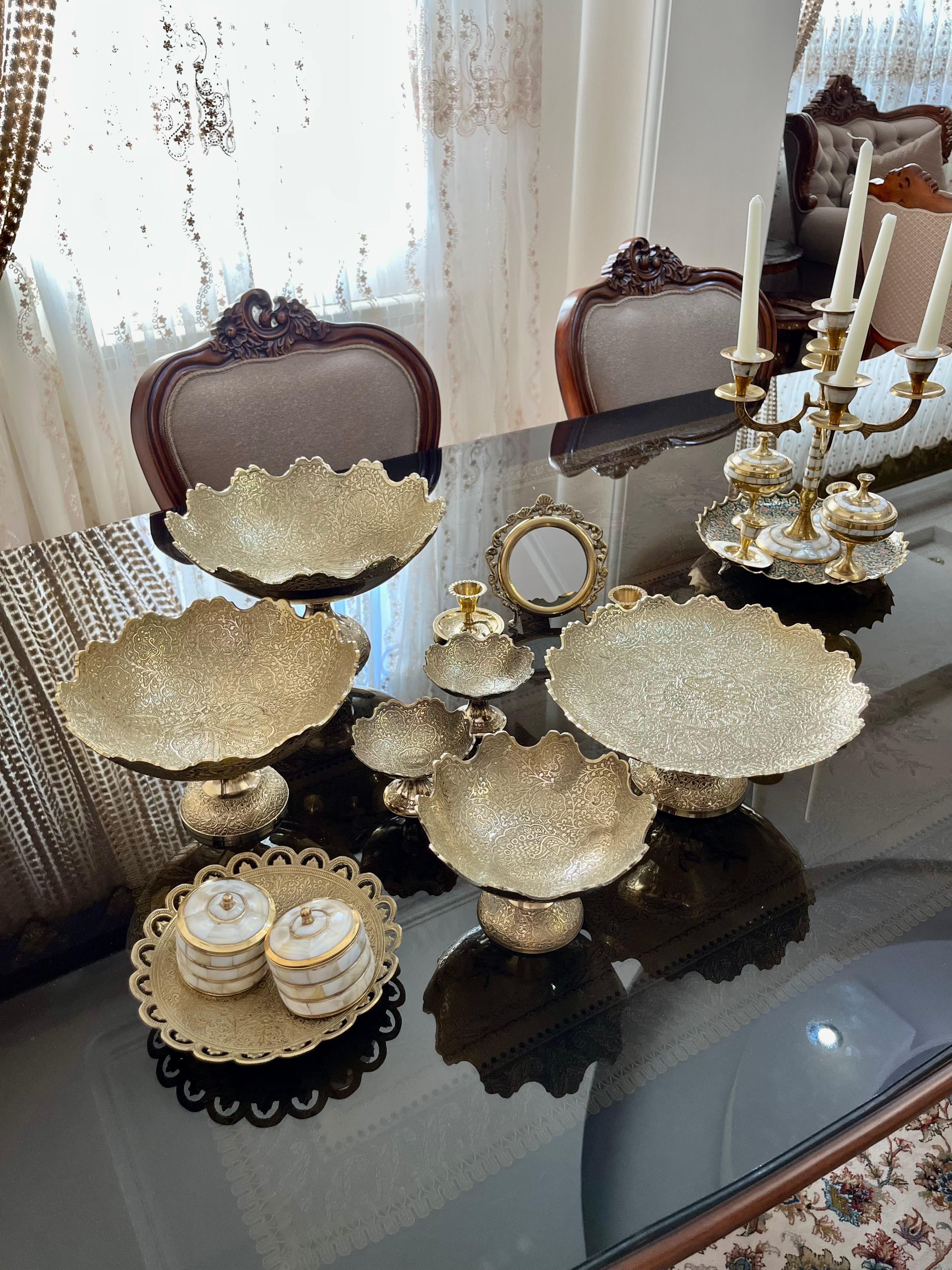 ناموجودکاسه پذیرایی برنجی طرح هلال ماه طلایی قلمزنی شده (چهار سایز)