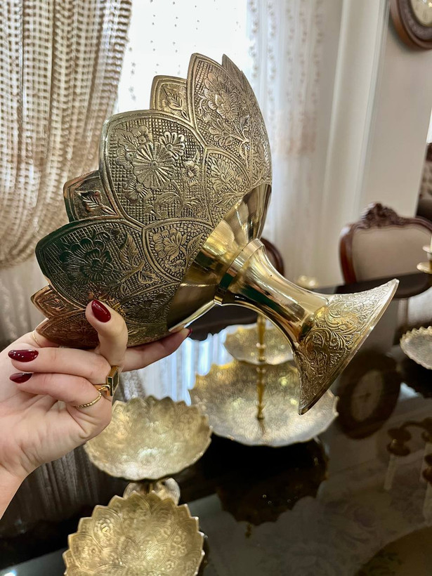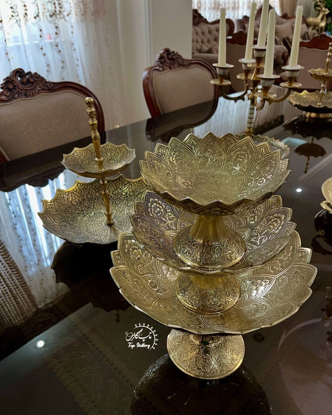 جنس این ظروف معمولاً از برنج یا آلیاژهای شبیه به آن است که رنگ طلایی و درخشان آن، شکوه خاصی به محیط میبخشد. این ست با طراحی پایه بلند و کاسههای لوتوسی، علاوه بر زیبایی، کاربردی است و میز شما را به بهترین شکل برای میزبانی آماده میکند. خرید ظروف پذیرایی برنجی طرح لوتوس، سرمایهگذاری بر روی کیفیت، اصالت و زیبایی است.