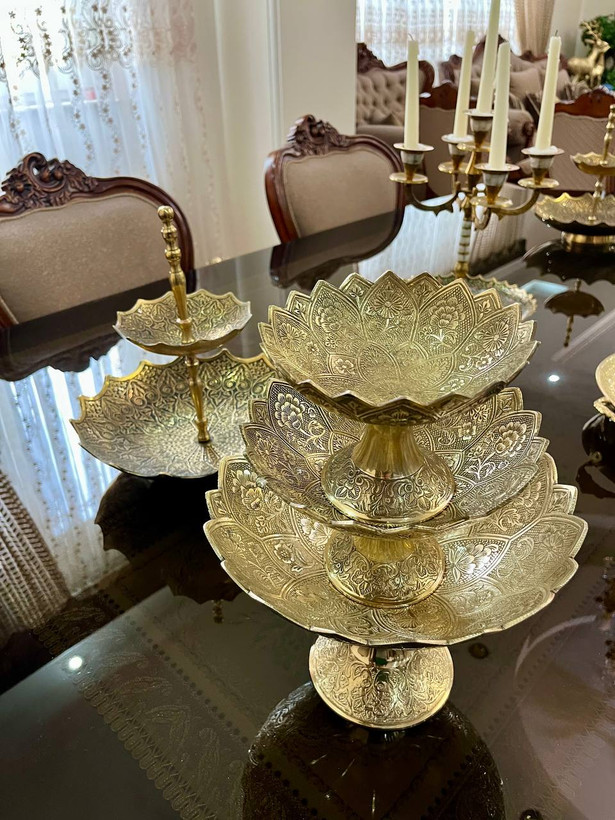 ست پذیرایی سه تکه هندی طرح لوتوس، تلفیقی بینظیر از هنر کهن قلمزنی و طراحیهای فاخر است که جلوهای سلطنتی و گرم به میز پذیرایی شما میبخشد. این ست لوکس، با الهام از گل مقدس لوتوس (نیلوفر آبی)، با نقوش ظریف و دقیق خود، تبدیل به یک قطعه دکوراتیو ماندگار میشود و برای جهیزیه عروس و میز پذیرایی عید انتخابی بینظیر است.
