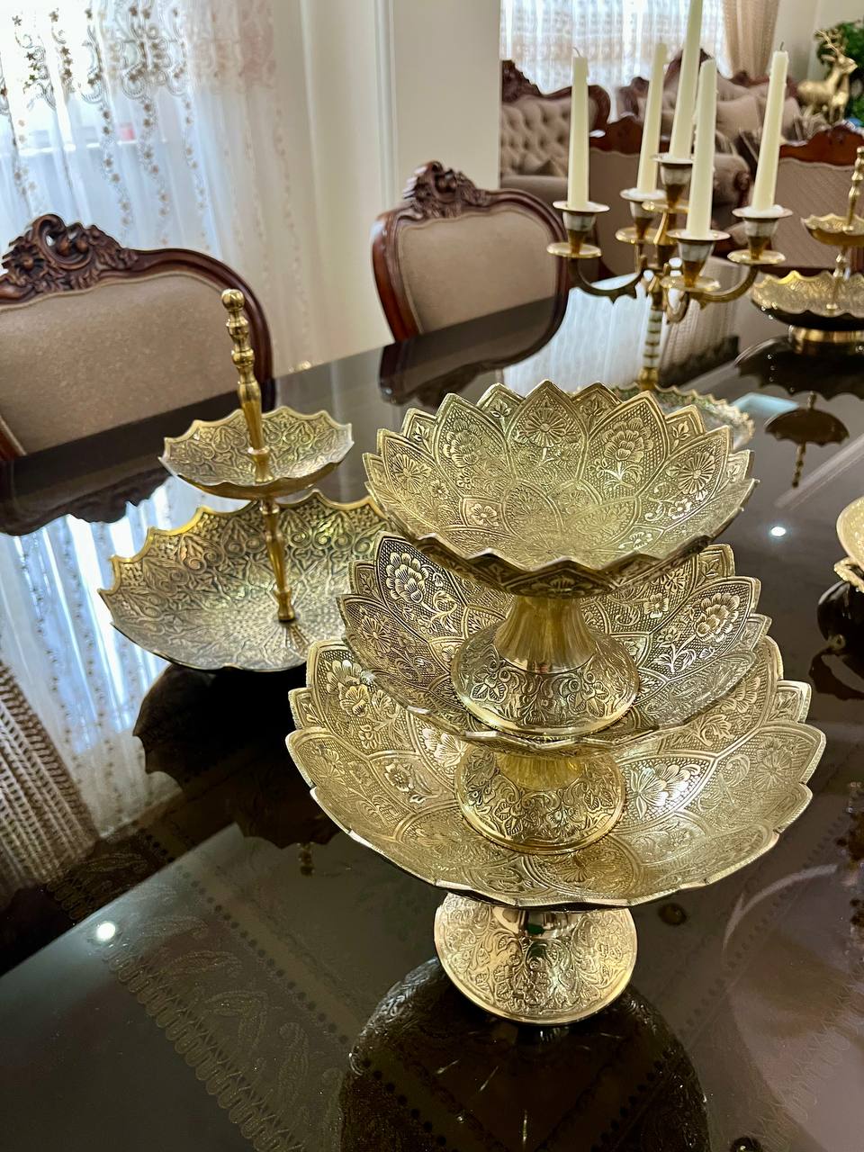 ست پذیرایی برنجی هندی سه تکه طرح لوتوس طلایی قلمزنی شده