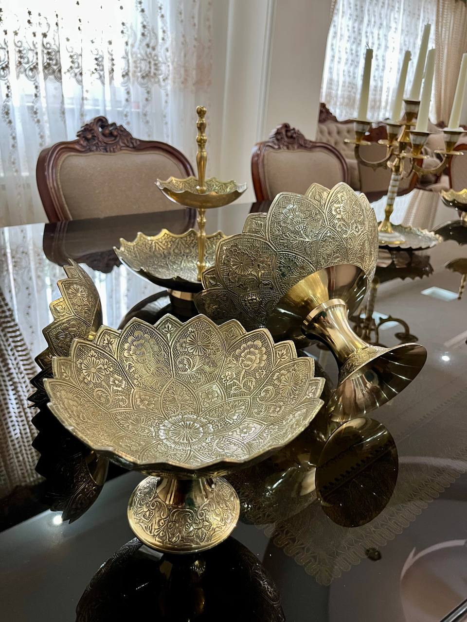 جنس این ظروف معمولاً از برنج یا آلیاژهای شبیه به آن است که رنگ طلایی و درخشان آن، شکوه خاصی به محیط میبخشد. این ست با طراحی پایه بلند و کاسههای لوتوسی، علاوه بر زیبایی، کاربردی است و میز شما را به بهترین شکل برای میزبانی آماده میکند. خرید ظروف پذیرایی برنجی طرح لوتوس، سرمایهگذاری بر روی کیفیت، اصالت و زیبایی است.