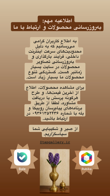 متأسفانه به دلیل کندی سرعت اینترنت داخلی، بارگذاری عکسهای جدید محصولات زمانبر شده است. ما تنوع بسیار زیادی از کارها داریم و دوست داریم همه آنها را به بهترین شکل به شما نشان دهیم!